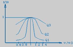 关系曲线。这里有三条曲线,对应三个不同的Q值,其中有Q1>Q2>Q3。从图中可看出当外加信号频率ω偏离电路的谐振频率ω0时,I/I0均小于1。Q值越高在一定的频偏下电流下降得越快,其谐振曲线越尖锐。也就是说电路的选择性是由电路的品质因素Q所决定的,Q值越高选择性越好。