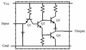 我们从一个典型逻辑电路入手,讨论局部退耦设计方法。图7是典型的非门(NOT GATE)电路。当输入(Input)低电平时,Q1打开,拉低Q2的基极,因此Q4的基极被拉低,Q3打开,输出(Output)高电平。