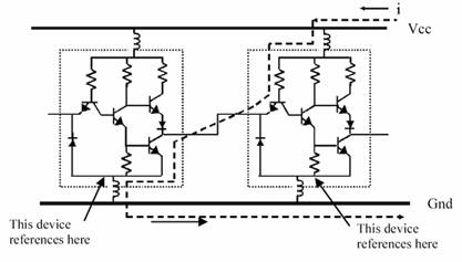逻辑电路在设计时采用了很多技术来保证器件本身不会发生这样的错误。但是,当器件安装到电路板上,板级系统的其他因素仍可能导致类似错误的发生。图8中级联的两个非门共用电源端Vcc和接地端GND。Vcc到每个非门供电引脚间都会存在寄生电感,每个非门的地引脚到GND之间也同样存在寄生电感。在实际板级电路中设计中,寄生电感不可避免,电源平面、地平面、过孔、焊盘、连接焊盘的引出线都会引入额外的寄生电感。图8已经画出了电源端和地端的寄生电感。当第一个非门输入高电平,其输出低电平。此时将会形成图中虚线所示的电流通路,第一个非门接地处寄生电感上的电压为:V=L*di/dt。这里i为逻辑转换过程形成的瞬态电流。如果电路转换过程非常快(高速器件内部晶体管转换时间已经降到了皮秒级),di/dt将是个很大的值,即使很小的寄生电感L也会在电感两端感应出很大的电压V。对于一些大规模逻辑芯片,接地引脚是内部非常多的晶体管共用的,这些晶体管同时开关的话,将产生很大的瞬态电流,再加上极快的转换时间,寄生电感上的感应电压更大。此时第一个非门的输出信号电平为:非门本身低电平电压+寄生电感上的电压。如果这一值接近2V,可能会被第二个非门判断为逻辑1,从而发生逻辑错误。