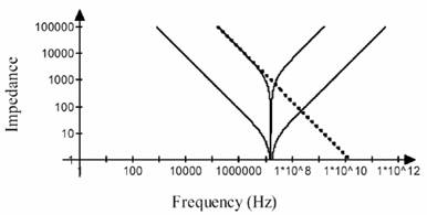 单个电容及并联电容的阻抗特性如图10所示。并联后仍有相同的谐振频率,但是并联电容在每一个频率点上的阻抗都小于单个电容。