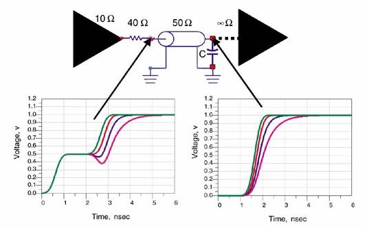 因此电容负载使源端信号产生局部电压凹陷。精确波形和传输线的特性阻抗、电容量、信号上升时间有关。